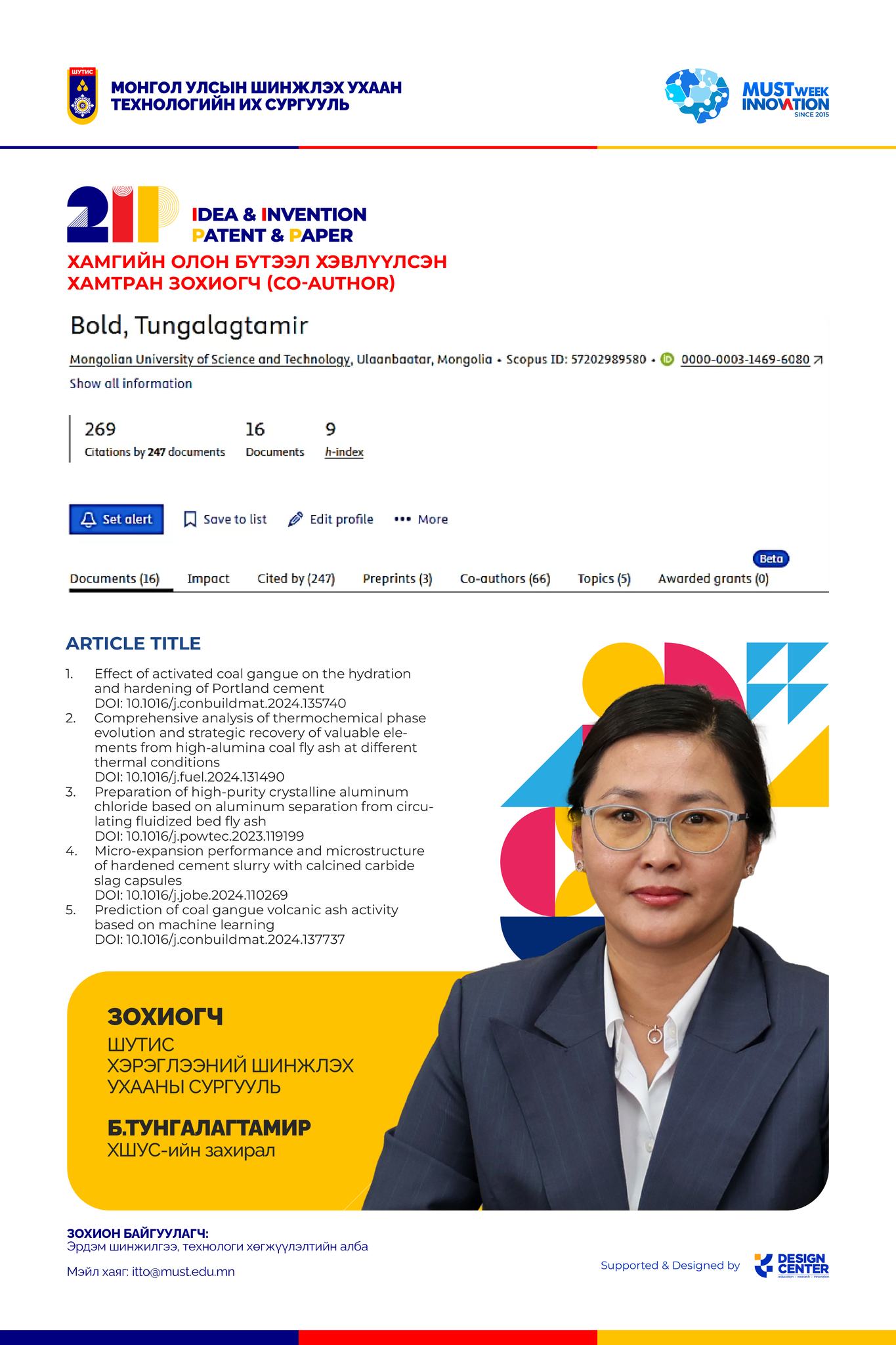 Хамгийн их эшлэгдсэн бүтээлийн холбоо барих зохиогчоор ШУТИС-ийн Хэрэглээний Шинжлэх Ухааны Сургууль-ийн Химийн инженерчлэлийн тэнхимийн эрхлэгч доктор, дэд профессор Ю.Ганчимэг
