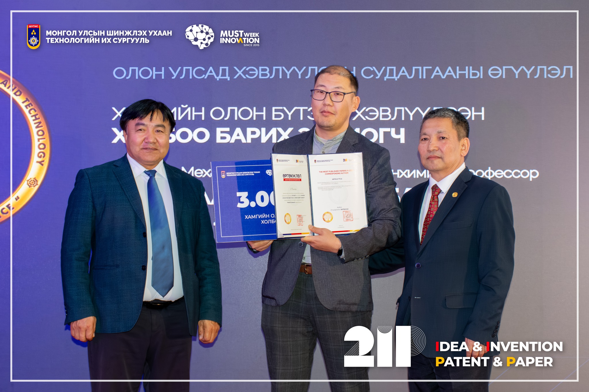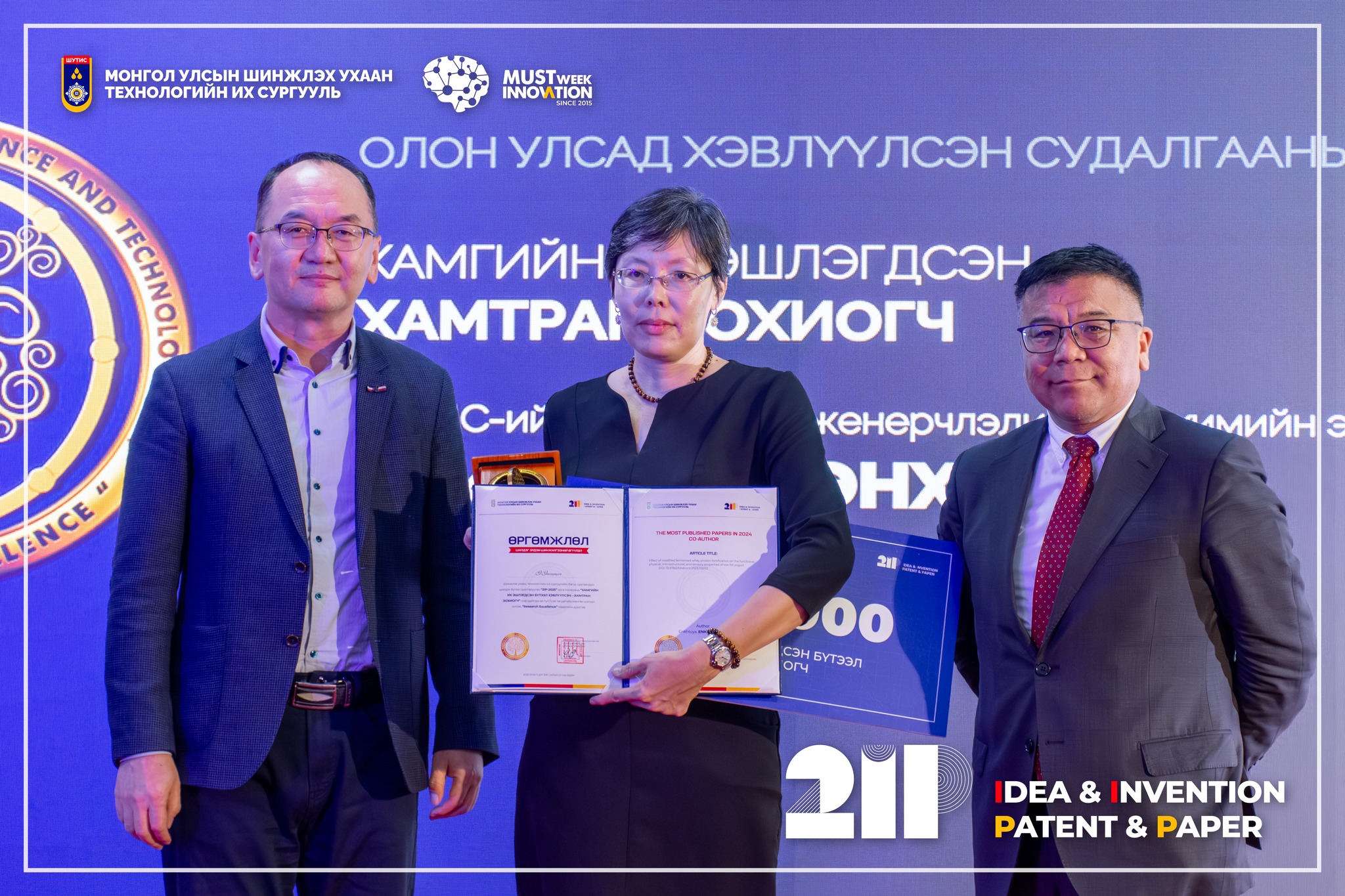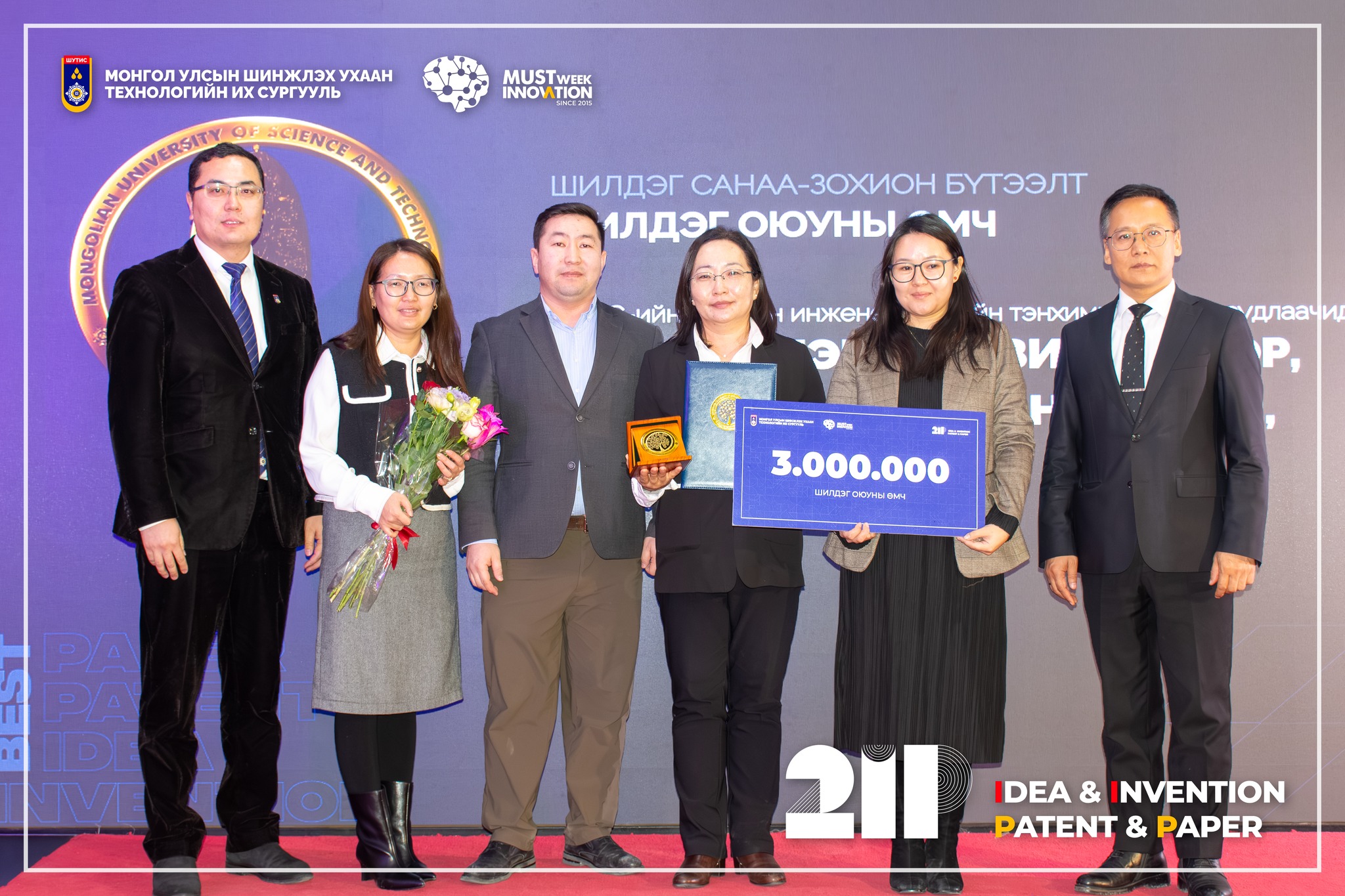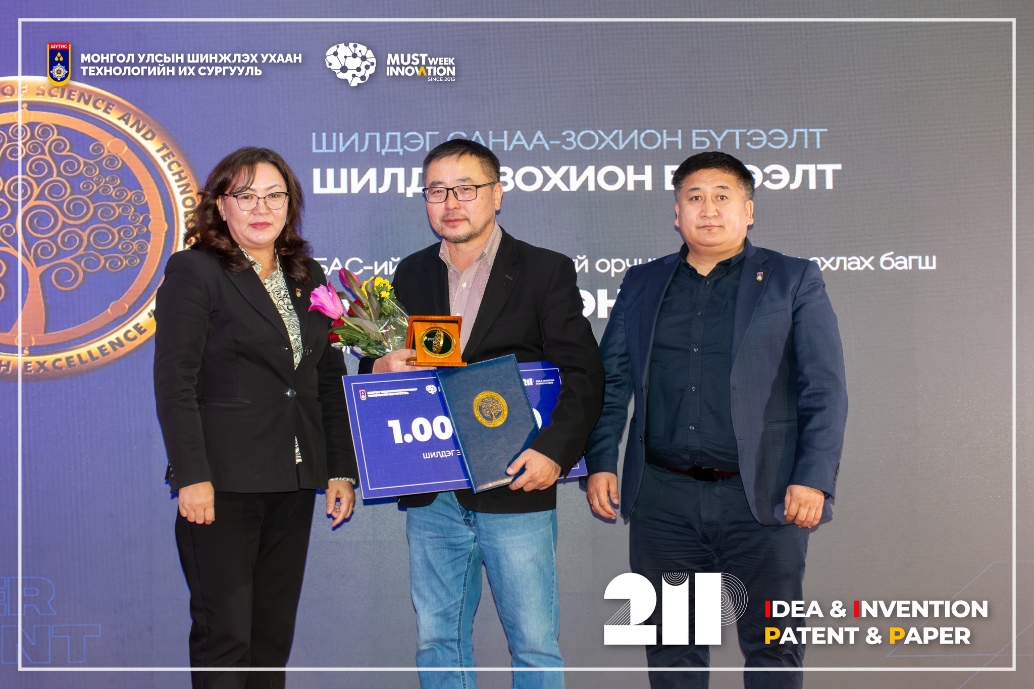 Мөн энэ удаагийн "2IP-2025" арга хэмжээний Академичийн нэрэмжилт шилдэг зохион бүтээлтээр "WPC-мод хуванцрын холимог хавтангийн технологи" нутагшуулах бүтээлийн зохиогч ШУТИС - Ой модны сургалт, судалгааны хүрээлэн-гийн салбарын эрхлэгч доктор Э.Тогтохбаяр
