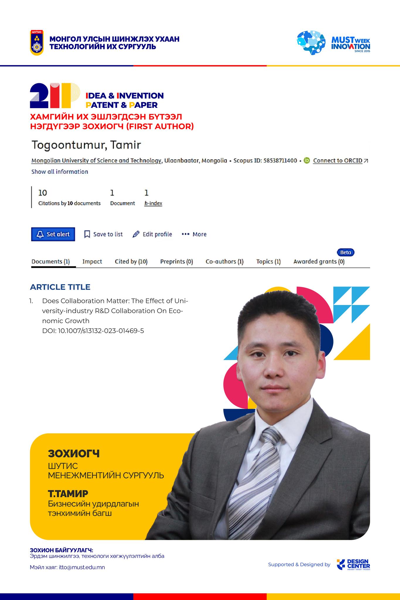 Хамгийн их эшлэгдсэн бүтээлийн нэгдүгээр зохиогчоор ШУТИС-Менежментийн сургууль-ийн багш Т.Тамир