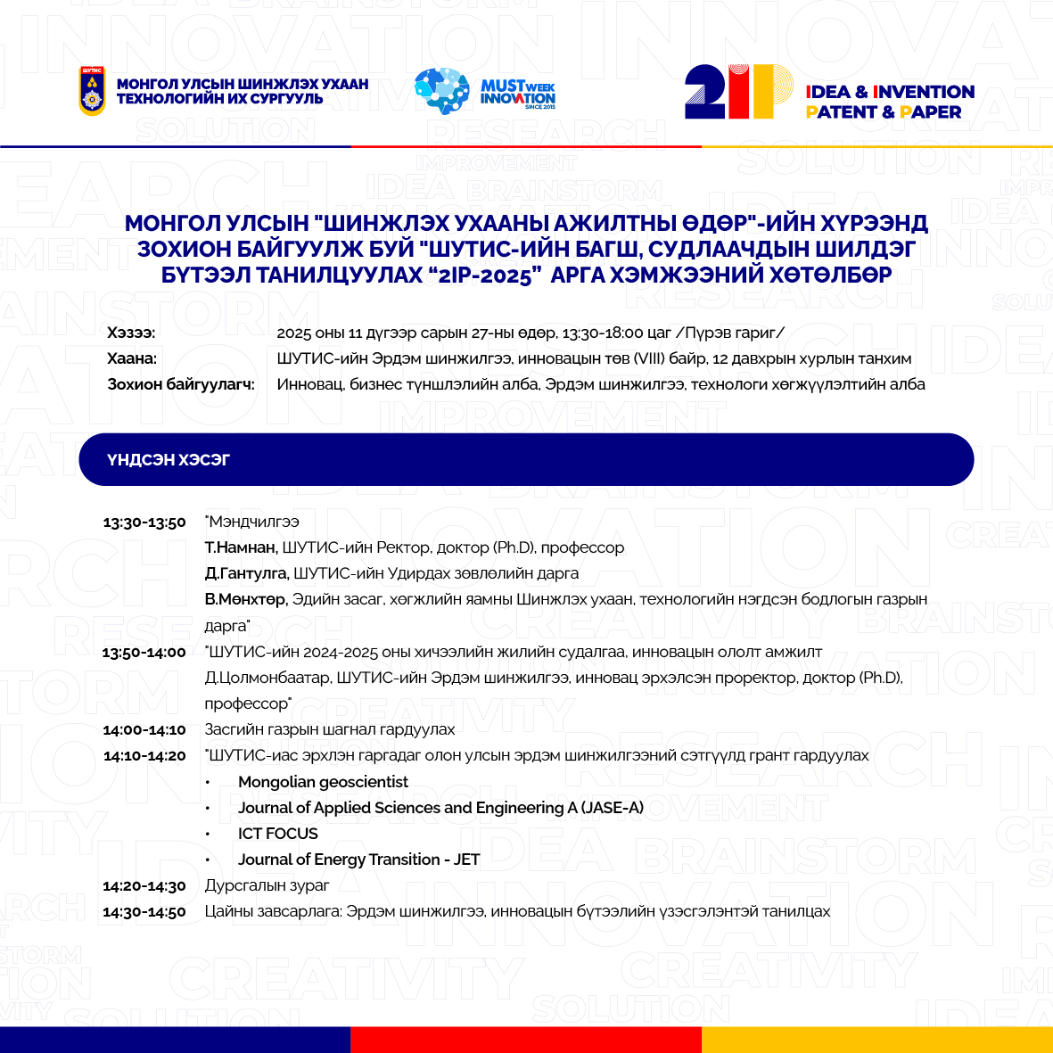 | 15:50-16:00 | ШУТИС-ийн Судалгаа, инновацын үйл ажиллагаагаар манлайлагч бүрэлдэхүүн сургуульд батламж гардуулах |