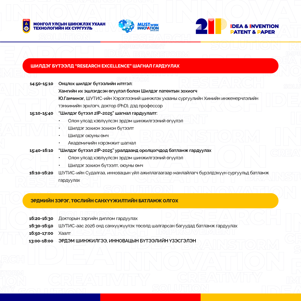 | 14:50-15:20 | “Шилдэг бүтээл 2IP-2024” шагнал гардуулалт: • Олон улсад хэвлүүлсэн эрдэм шинжилгээний өгүүлэл • Шилдэг зохион зохион бүтээлт • Шилдэг оюуны өмч • Академич Д.Энхтуяагийн нэрэмжит шагнал • Уул уурхайн хүрээлэнгийн нэрэмжит шагнал |